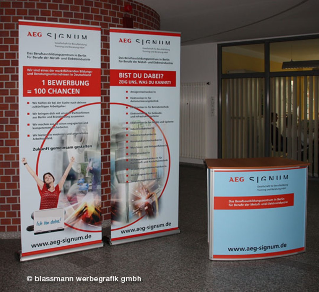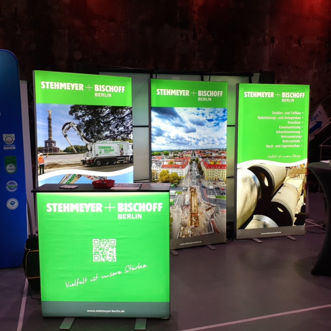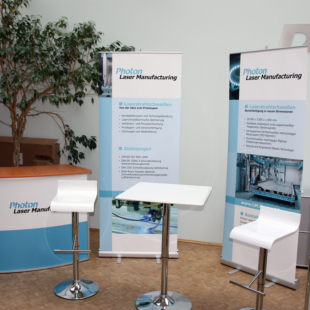 Messe- und Ausstellungssysteme wie Roll-ups, Banner-Displays, Truss-Systeme  und modulare Messestände.